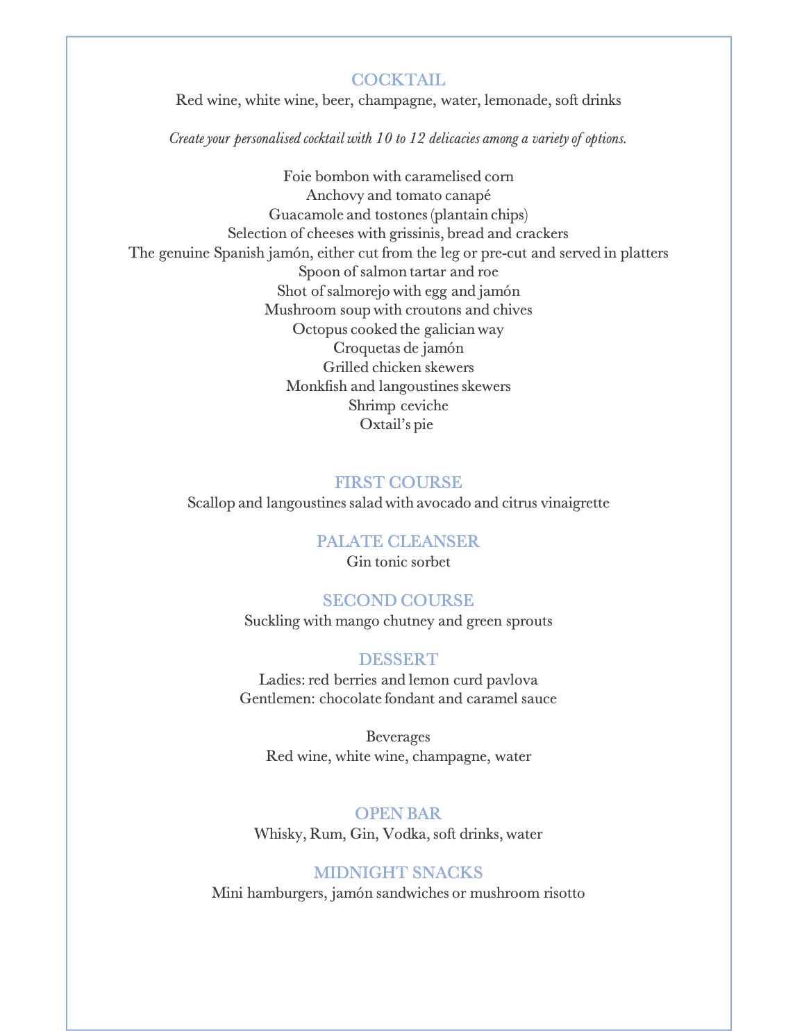 Please keep in mind the details above are only a sample of what you can expect at your Destination Wedding in Spain. You will be able to personalise everything to suit your needs and desires.